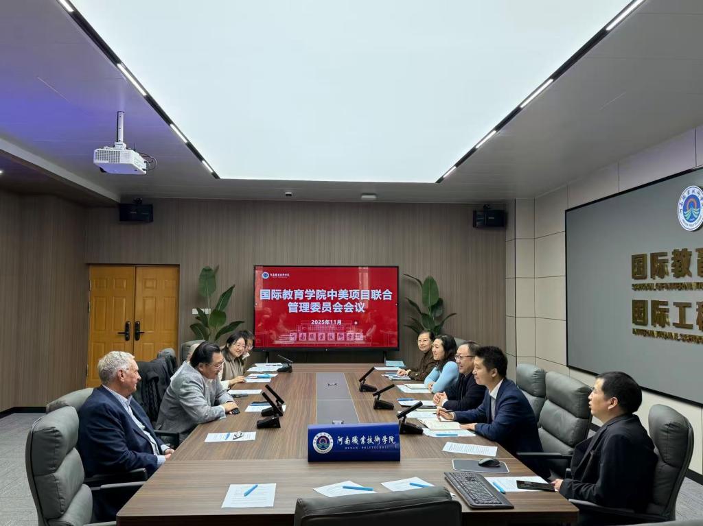 2025年11月14日下午,中美合作办学项目2025年度管理工作会议在健行楼302会议室召开。美国夏威夷卡比奥拉尼学院(KCC)代表CY S.Feng先生、中国区首席代表杨柏、河南职业技术学院副校长鲁冬、国际合作交流处、国际教育学院相关负责人员出席会议,会议由国际合作交流处处长王伟主持。